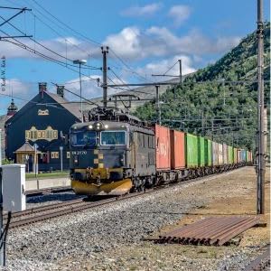 Der namensgebende Ort des gesamten Landstriches ? Dovre ? ist heute ein kleines Städtchen mit einem kleinen Bahnhof fernab jeglicher Bedeutung. Containerzug der CargoNet nach Süden, Juli 2022.