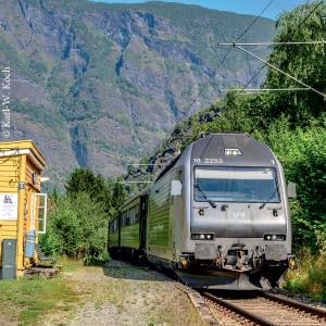 Der Mittagszug nach Myrdal durchfährt den Bedarfshalt Lunden Stasjon, ohne dass "Bedarf" zum Ein- oder Aussteigen (?) angemeldet worden wäre (Juli 2021). Im Hintergrund die Felswand über dem Aurlandsfjord.